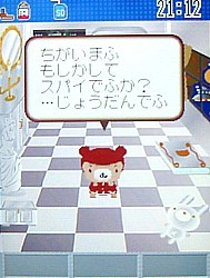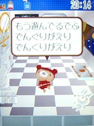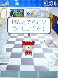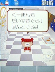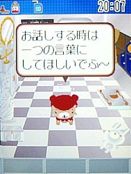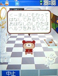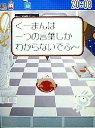 今日はくーまんとのおはなしについて。 V604T以前の機種では出来たお話機能。携帯に話しかけるなんて...と思いながらも、くーまんと双方向でコミュニケーションできるのって画期的!音声認識までできるなんてすごいですよね! どんなかというと、こんな感じ。 おはなししてみるでふ。 「こんばんは!」 今日のくーまんははじけています。ノリノリです。そんなくーまんには、こう言ってみます。 「だいすき!」 「かわいい」だったかも?) ほんとでふよ~。「だいすき~!」 今日のくーまんはノリノリなので、こう言ってみます。 「遊ぼう!」 本当に今日は元気いっぱい。 さらに「遊ぼう!」 もう止まりません。 でも、聞き取れないと、こんな感じ。 ちゃん言ってるんだけどねー。聞き取れないとすねちゃいます。 じたばたじたばた。 でも、秘密の言葉を言ってもちゃんと反応してくれます。 それは、「ビビデバビデブ~!」 「ん?!」 ビビデバビデフだったの?!「でふ」つながり?それでこの言葉にも反応するんだったの?!気がつかなかった...。 同じ言葉を言ってもいろんな反応をしてくれます。 「ビビデバビデブ~!」 冗談も言っちゃいます。 といった感じ。もっといろんなことをおしゃべりしてくれます。 さすがに周りに人がいるところでは、携帯に向かって喋るというのはかなりやりづらい事だけど、くーまんから話かけられるだけでなく、話かけた言葉に反応してお返事してくれるのって、結構楽しい機能かも。 いつかこの機能、復活するかな?しないかな? (頂いたコメントを転記させて頂きます。私のレスは省略しています。)