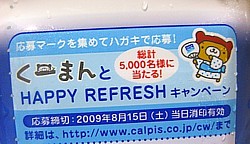 時々コンビニも覗いていましたが置いてなくて、先ほど初めて出会いました。 セコイ話ですが、私は普段500mlペットボトルや缶ジュースなどを殆ど買わないので、この147円は珍しい出費でした。ああ、ホントにセコイ話!...でも、本当に買わないので今缶ジュースやペットボトルが自動販売機でいくらなのかとか知らないのですよ。 くーまんとHAPPY REFRESHキャンペーン、応募は3コースありますが、どれが人気なのでしょうね。 「くーまん特集」、たからもの(レトロシリーズ)追加しました。