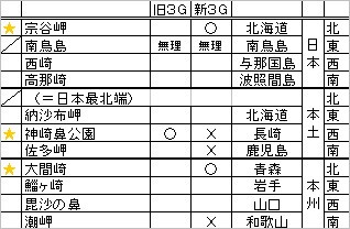 以前日本のはしっこについてリストアップした記事を書きました。大体同じですが、その後分かった事も付け加えて表にしてみたいと思います。 この内1ヶ所に行ってみようかと考えていたのだけど、ちょっと予定が狂って行く事は出来ず。 それにしても、本当にどこも簡単には行けない場所ばかり。。。 追記: あ、佐多岬は旧3GでもXって聞いたんだった! 「くーまん特集」、日本のはじっこ2ヶ所目をアップです!