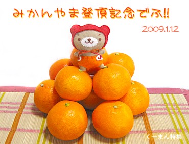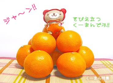 久しぶりのくーまん2号でふ!!(って、すっかりこの名前になってしまった…。) 今日はみかんのおやまに登ってみたでふ! 登頂記念にお写真撮ってみたでふ! みかんのおやまは高いのでふ。 やったでふ~~~ 最後にみかんちゃんたちと一緒にもう1枚パチリ。 今年もよろしくお願いしまふ せっかくなので、このお写真、後で「くーまん特集」のおまけのギャラリーにも追加しておきます。拍手+ひとことコメント、ゲストブックにメッセージ、このブログに感想、どれも歓迎でふ! お買い物をしていたら、「落ちましたよ。」と言われ下を見ると